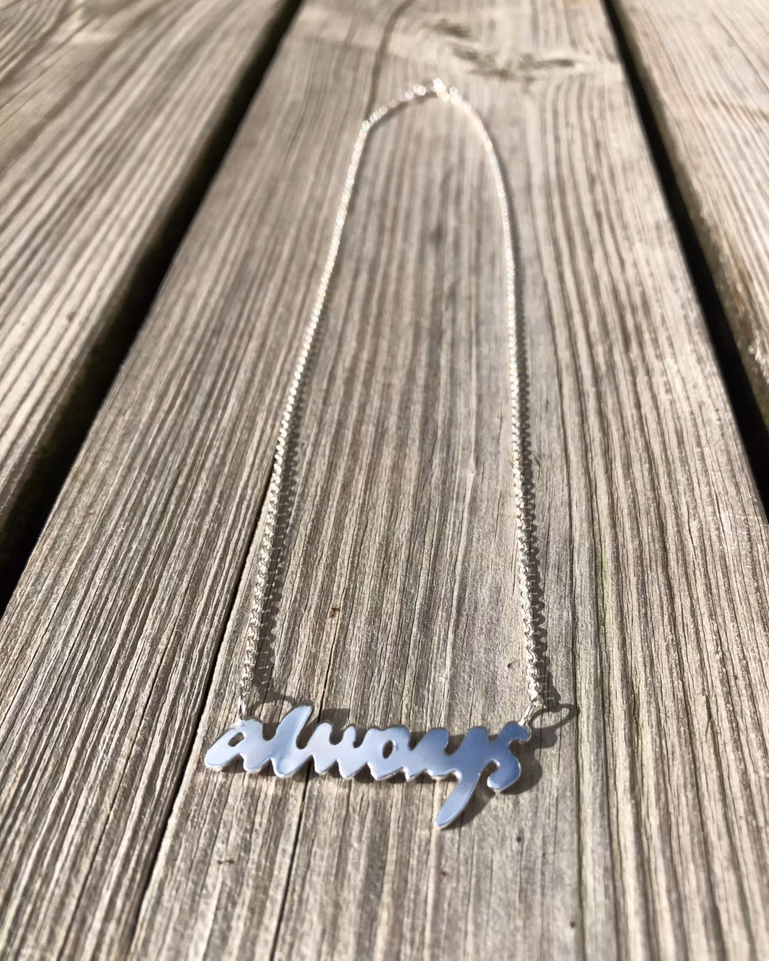 Texten "Always" är utsågad för hand i återvunnet silver och mäter ca 5 cm i längd (själva texten).