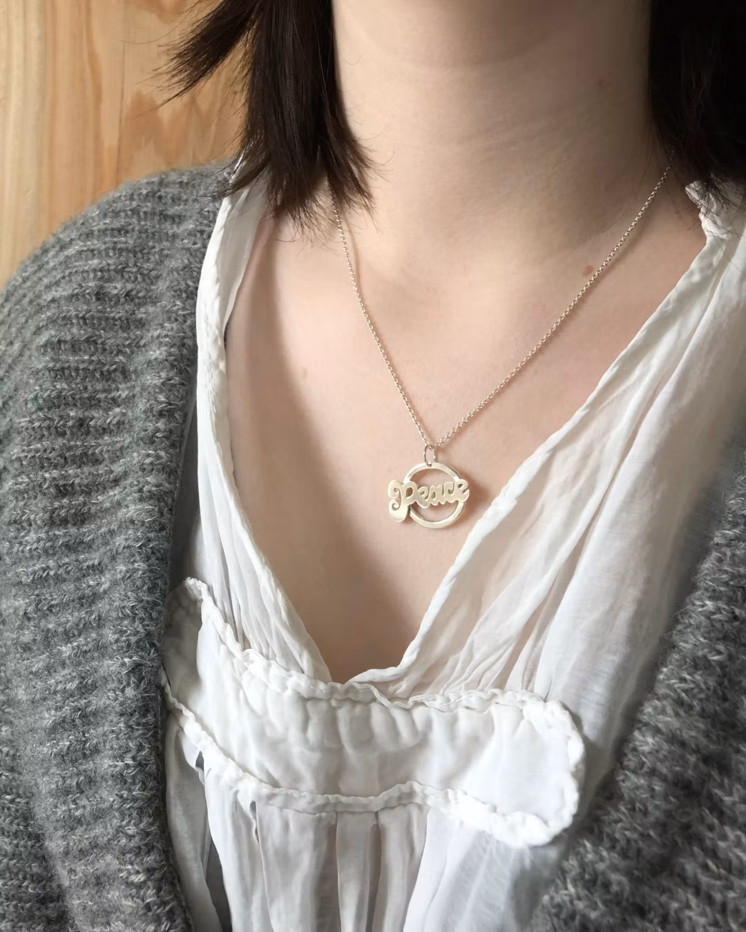 Halsband i 100% återvunnet Sterling silver med den utsågad text Peace. Tillverkat för hand i Varberg.
