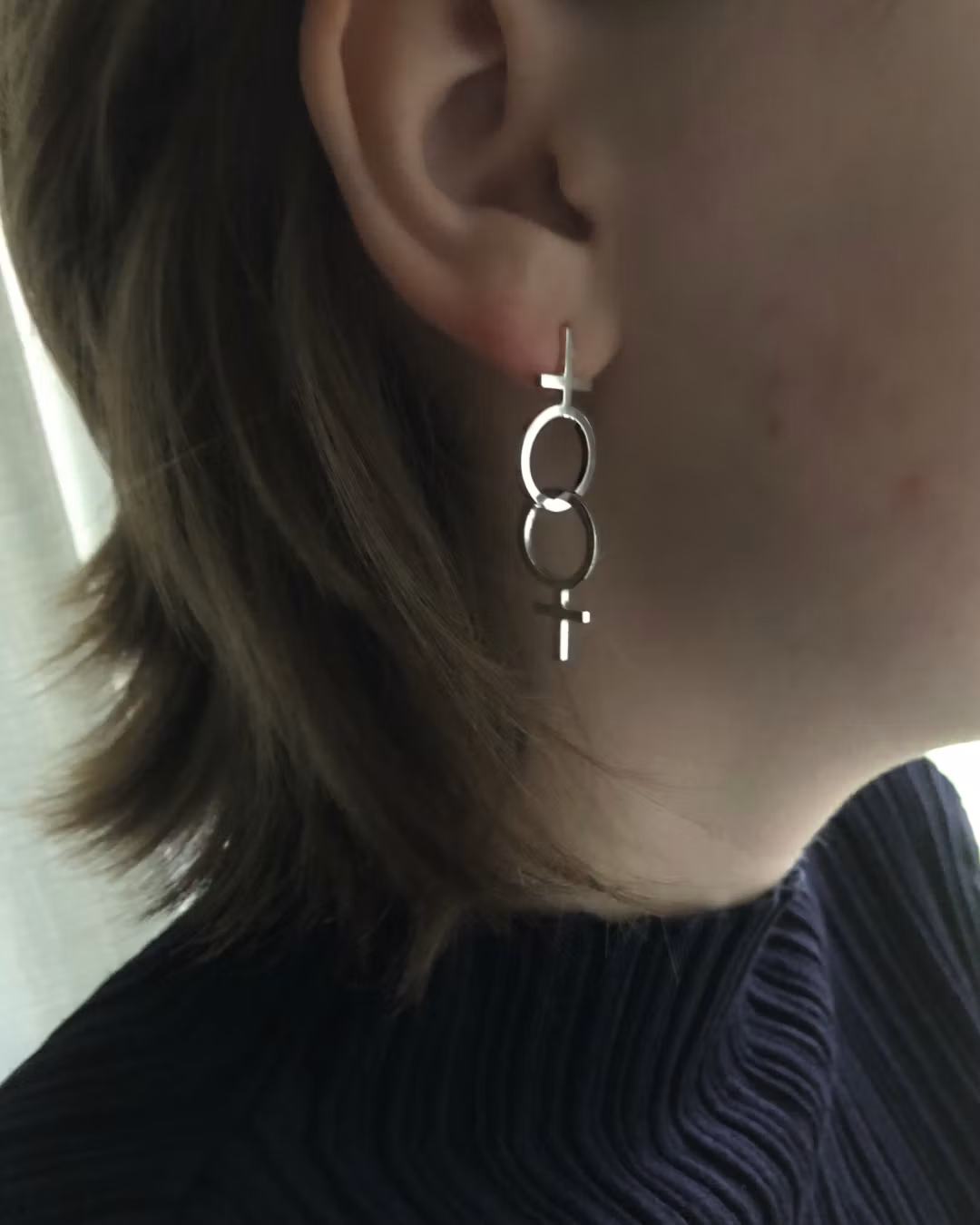 Det ena örhänget består av två sammanlänkade kvinnosymboler, två feminist tecken, som får symbolisera systerskapet. Jag lägger även gärna in tolkningen att vi älskar vem vi vill, oavsett vilket kön (eller inget) vi identifierar oss med. Det andra är en liten rund kula av silver.
